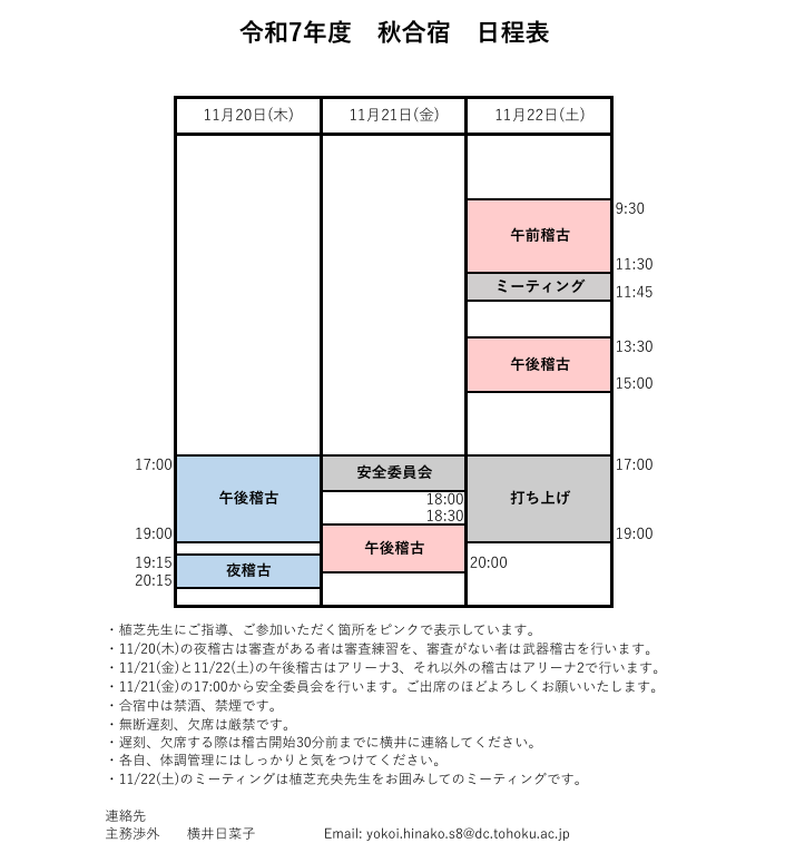 著者: 現役幹部1411月, 2025 令和7年度 秋合宿のご案内 秋合宿日程表ダウンロード お世話になっております。65代の米倉です。 11月20日(木)~11月22日(土)に秋合宿を行います。 詳細な日程につきましては添付のPDFファイルまたは画像をご確認ください。 よろしくお願いいたします。