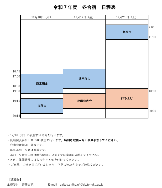 著者: 現役幹部1112月, 2025 令和7年度 冬合宿のご案内 65代の米倉です。12月18日(木)~20日(土)にかけて冬合宿を行います。 詳細な日程につきましては添付画像をご確認ください。 よろしくお願いいたします。